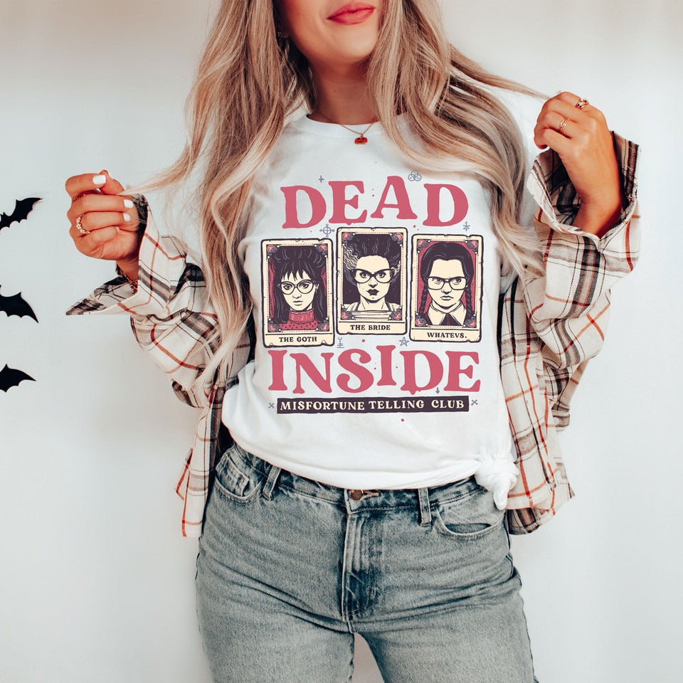 Feeling blue? Don't just wear it, flaunt it in this "Dead Inside" Misfortune Telling Club Tee! Whether you want to stand out with a white or blend in with a deep grey heather, you'll be sure to make an impression. Comfortably breezy for those summer days - this short sleeve, unisex, relaxed fit shirt is the perfect wardrobe upgrade for whatever the future holds!