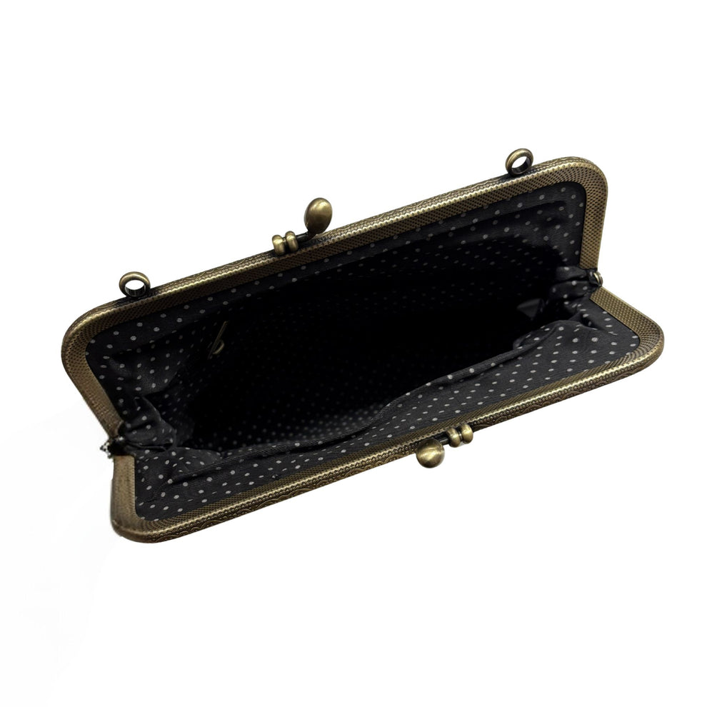 Boo-tifully charming! This Ghost in Flower Field Bag blends whimsy with practicality in a cotton-linen blend that's as delightful as it is durable. The adorable ghost centerpiece floats among florals and mushrooms, while a kisslock clasp keeps your essentials secure. Inside, you'll discover a fabric-lined interior with a zippered pocket for extra organization. Style it your way—carry it by hand, sling the detachable 5-inch faux leather strap over your shoulder, or go glam with the 26-inch chain strap. At 9.5" long, 1.5" wide, and 7" high, it's the perfect size for everyday adventures or special occasions. Versatility never looked so enchanting!