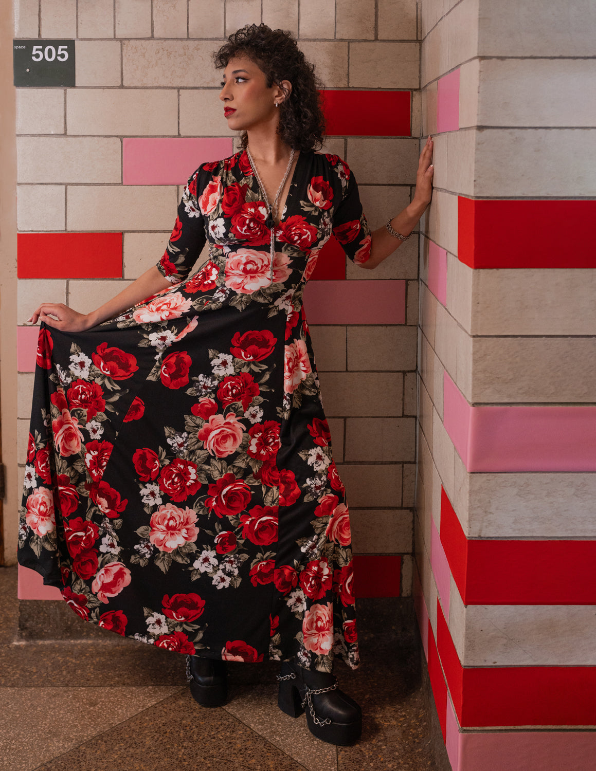 Raquel 3/4 Sleeve Maxi Dress in Red Rose Print