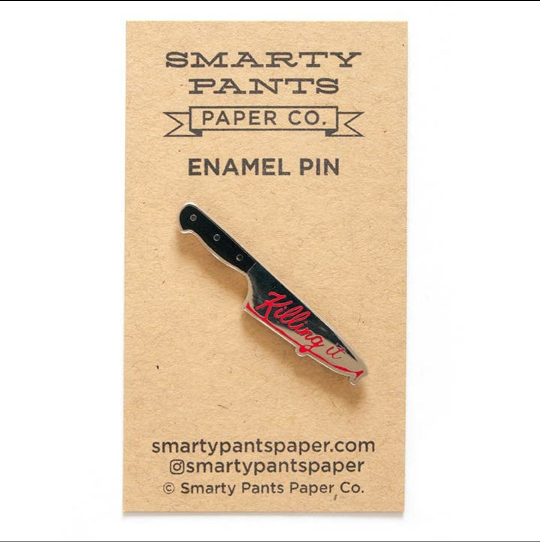Slay the style game with our "Killing It" Knife Enamel Pin, measuring at 1.75 inches wide. Made with a rubber clutch, silver metal, and cloisonné enamel - this pin is killer.