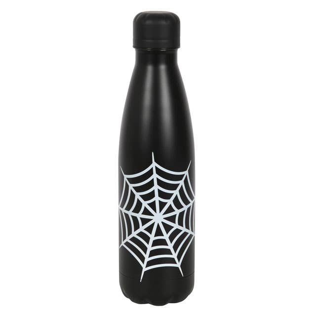This black metal water bottle makes a great eco-friendly replacement for plastic and features a cool spiderweb design. This item features a convenient screw-top lid to prevent accidental spills. 500ml capacity. Hand wash only. Do not microwave. Suitable for hot or cold beverages. BPA free. Designed by Something Different Wholesale and part of the Dark Lair range of gothic bat and spider giftware.