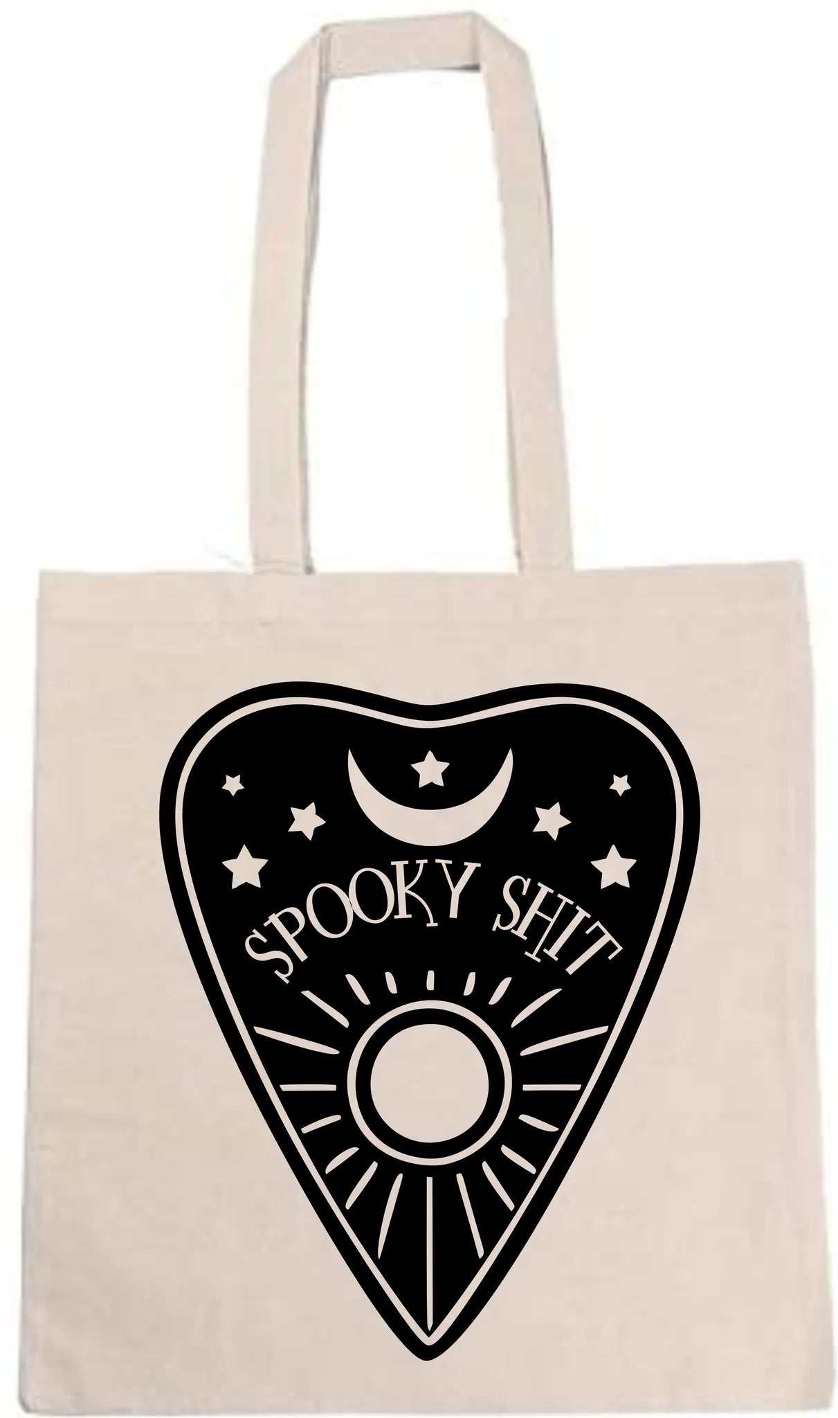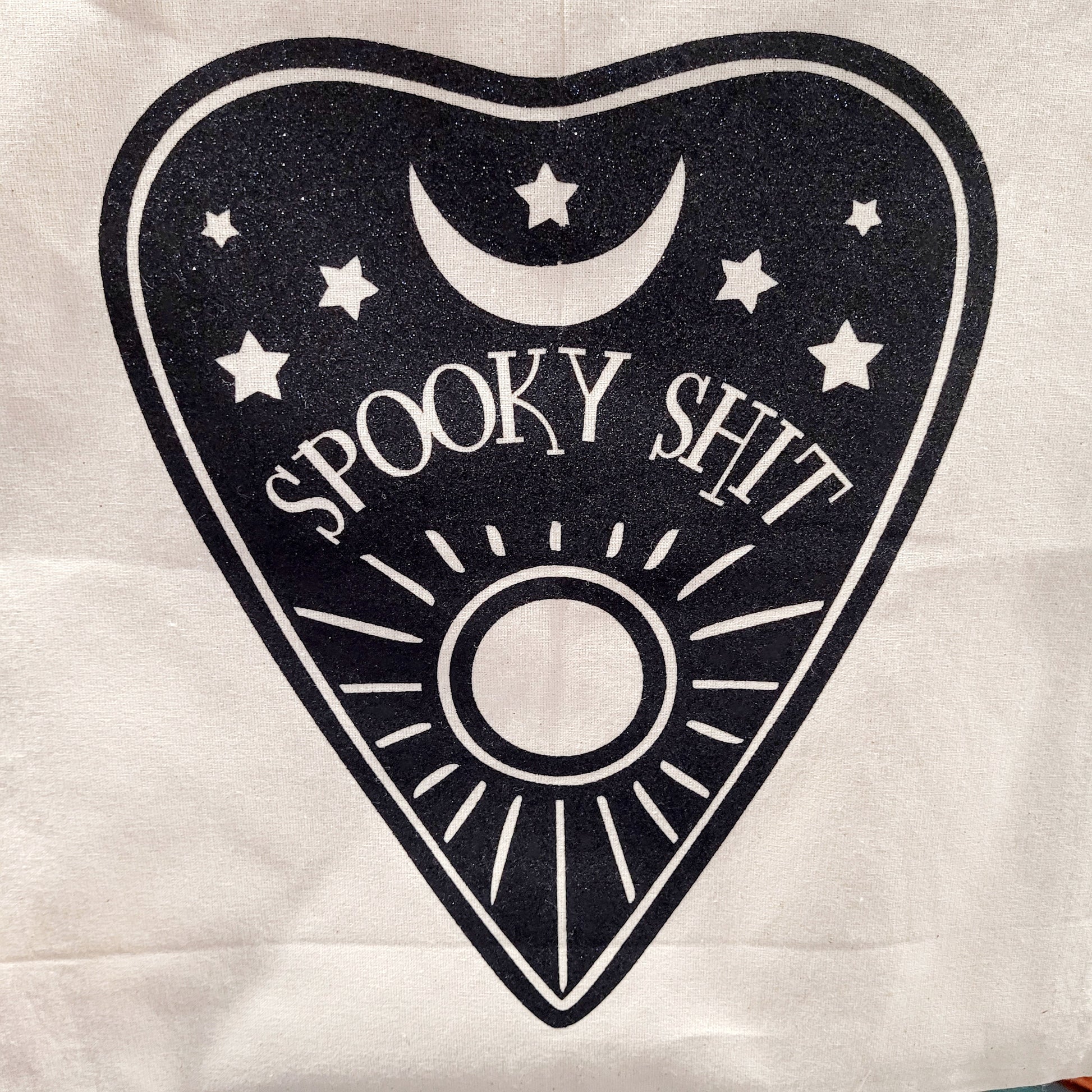 Show off your unique style and embrace your fascination with the supernatural with this striking "Spooky Shit" Black Glitter Planchette Ivory Canvas Tote Bag. It's the perfect accessory for those who appreciate the mystery and delight in the darker side of life. Order yours today and let your inner witch shine!